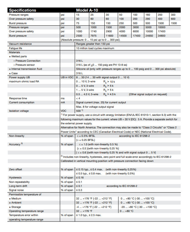 Specifications Optionally the model A-10 is available with an improved non-linearity. Depending on the selected non-linearity the following values result: Accuracy specifications Non-linearity ≤ ±0.5 % of span Non-linearity ≤ ±0.25 % of span Non-linearity per BFSL per IEC 61298-2 Measuring range ≤ 0.1 bar [≤ 1.45 psi] ≤ ±0.5 % of span - Measuring range > 0.1 bar [> 1.45 psi] ≤ ±0.5 % of span ≤ ±0.25 % of span 1) Accuracy → See “Max. measured error per IEC 61298-2” Max. measured error per IEC 61298-2 Measuring range ≥ 0.6 bar [≥ 8.7 psi] ≤ ±1 % of span ≤ ±0.5 % of span Measuring range ≥ 0.4 bar [≥ 5.8 psi] ≤ ±1.2 % of span ≤ ±0.7 % of span Measuring range ≥ 0.25 bar [≥ 3.6 psi] ≤ ±1.3 % of span ≤ ±0.8 % of span Measuring range ≥ 0.16 bar [≥ 2.3 psi] ≤ ±1.5 % of span ≤ ±1 % of span Measuring range ≥ 0.1 bar [≥ 1.45 psi] ≤ ±1.8 % of span - Measuring range ≥ 0.05 bar [≥ 0.73 psi] ≤ ±2.4 % of span - Zero point error 2) 3) 4 ... 20 mA / DC 1 ... 5 V / DC 0.5 ... 4.5 V / DC 0.5 ... 4.5 V ratiometric ≤ ±0.3 % of span ≤ ±0.2 % of span DC 0 ... 10 V ≤ ±0.5 % of span ≤ ±0.4 % of span DC 0 ... 5 V 4) ≤ ±0.6 % of span - 1) Not possible with output signal DC 0 ... 5 V. 2) Measuring ranges ≤ 0.1 bar [≤ 1.45 psi] (or equivalent) only possible with ≤ ±0.5 % of span. 3) Outside reference conditions, add the temperature hysteresis for measuring ranges < 0.6 bar [< 8.7 psi]. 4) Not possible with measuring ranges ≤ 0.1 bar [≤ 1.45 psi] (or equivalent). In case of occasional faults due to electrostatic discharges, a temporary additional measured error of up to ±2.5 % can occur.![]()