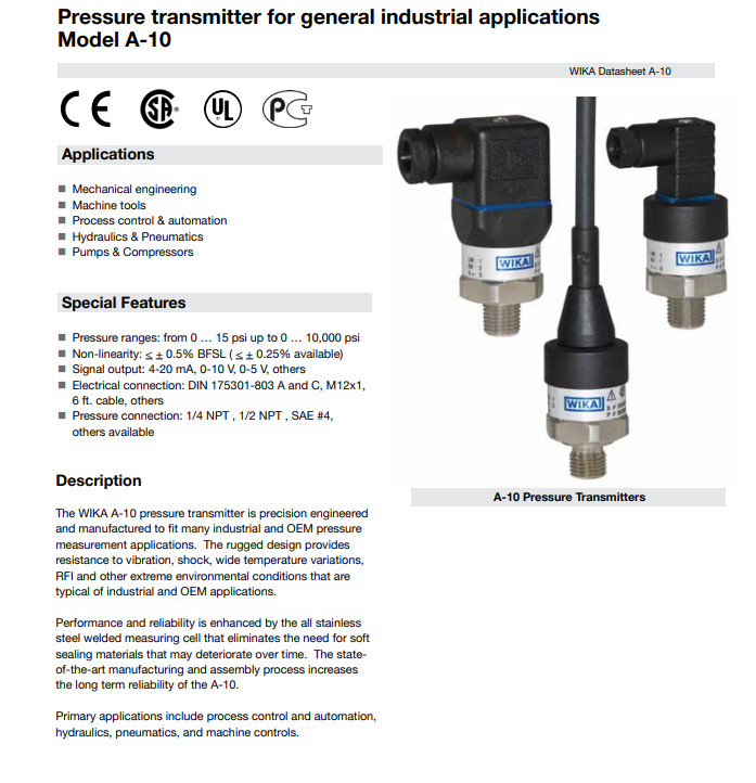 : High-quality pressure transmitter for general industrial applications; model S-20; see data sheet PE 81.61 Pressure sensor with IO-Link; model A-1200; see data sheet PE 81.90 data sheet PE 81.60 ∙ 05/2023 Pressure transmitter For general industrial applications Model A-10 Description The field-proven model A-10 pressure transmitter (pressure sensor) is the all-rounder for pressure measurement in industrial environments. Compactly built, it can be integrated into a wide range of machine designs. The many measuring ranges, and special measuring ranges, contribute to its universal applicability. Excellent quality and proven technology Our many years of experience and precise knowledge of customer needs have been incorporated into the development of the model A-10. It has been proving itself in countless applications for over ten years. The consistently high quality and its reliable function are appreciated worldwide and regularly confirmed by both internal and external audits. This bestseller can tolerate up to 100 million load cycles with almost constant precision. Exceptionally large variety covers almost all applications Depending on the requirement, the model A-10 measures Applications ■ Machine building ■ Measurement and control technology ■ Hydraulics and pneumatics ■ Pumps and compressors ■ Shipbuilding