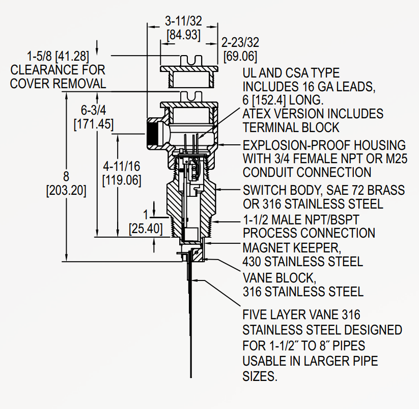 • Features a free-swinging vane which attracts a magnet within the solid metal switch body, actuating a snap switch by means